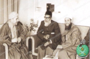 وفي هذه الصورة يرى الأستاذ عبدالحكيم بملابس غير التي شهدتها كل صورة حيث يجلس في بيته ويلتقى مع العالم الجليل أبو الحسن الندوي.