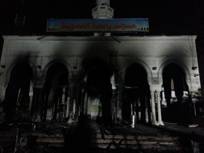 مسجد رابعة وغيره من المساجد لم تسلم من نيران وبطش العسكر؛ فرغم قدسية بيوت الله لم يتوان جنود النظام عن تدنيسها وتبرير ذلك بحفظ الأمن والنظام.