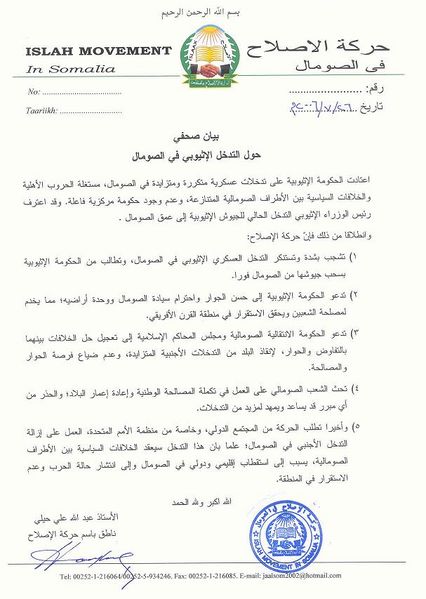 بيان صحفى حول التدخل الإثيوبى فى الصومال