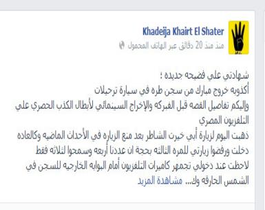 وإليكم تفاصيل القصة قبل الفبركة والإخراج السينمائي لأبطال الكذب الحصري علي التلفزيون المصري ذهبت اليوم لزيارة أبي خيرت الشاطر بعد منع الزيارة في الأحداث الماضية وكالعادة دخلت ورفضوا زيارتي للمرة ألثالثه بحجة أن عددنا أربعه وسمحوا لثلاثة فقط