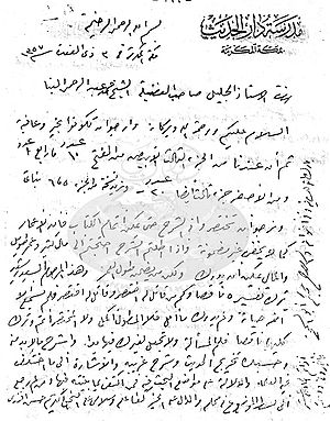 السلام عليكم ورحمه الله وبركاته جرى ذكر الفتح الربانى أمام الأمير عبد الكريم فاشتاق الحصول على نسخة منه وظهر أن الرجل فاضل له إلمام بعلوم الحديث والفقه والدين وقد اعتزم زيارتكم وأكد فى معرفة العنوان ولكن يحسن أن تزوره انتم أولا باعتباره ضيفا ويحسن كذلك إهداؤه نسخة من الفتح باسمكم وأجلدها على حسابى فما رأيكم فى هذا الاقتراح وماذا تم فى نسختى أنا والسلام عليكم ورحمه الله وبركاته.